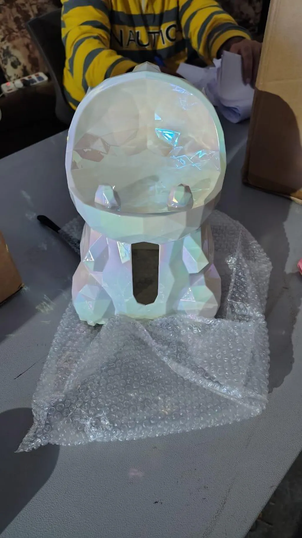 This decorative piece is absolutely mesmerizing! The faceted, geometric design paired with the iridescent crystal-like finish gives it a modern yet luxurious look. The light reflections change beautifully with every angle, making it a true statement piece for any space.