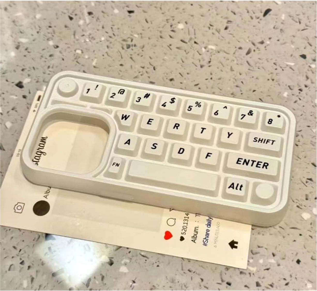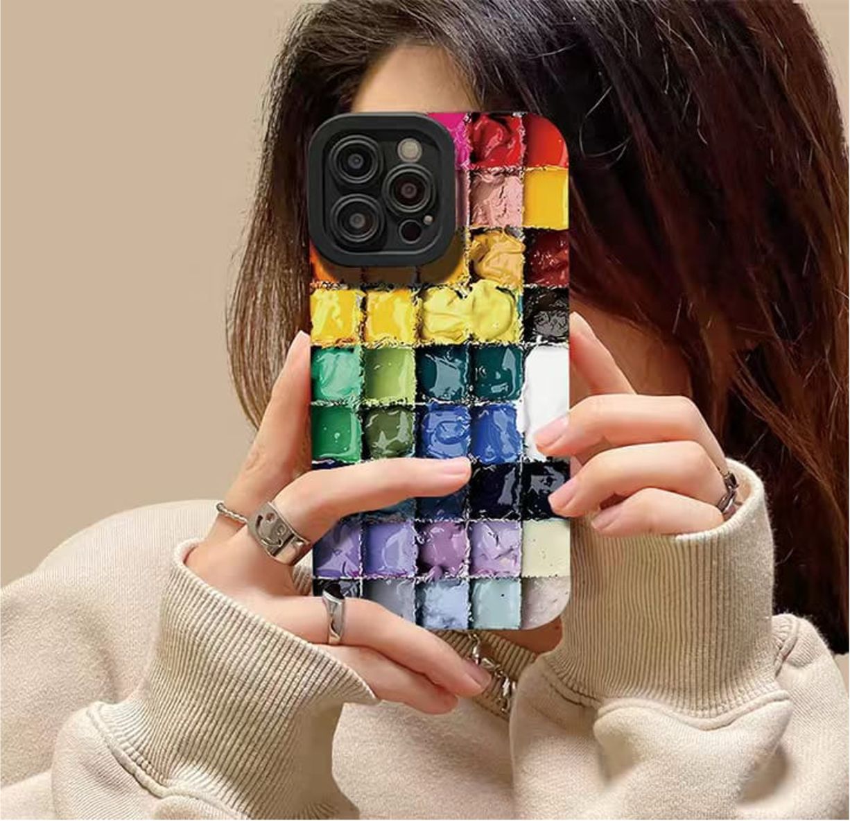 • Red phone case with a unique design held by a hand against a neutral background