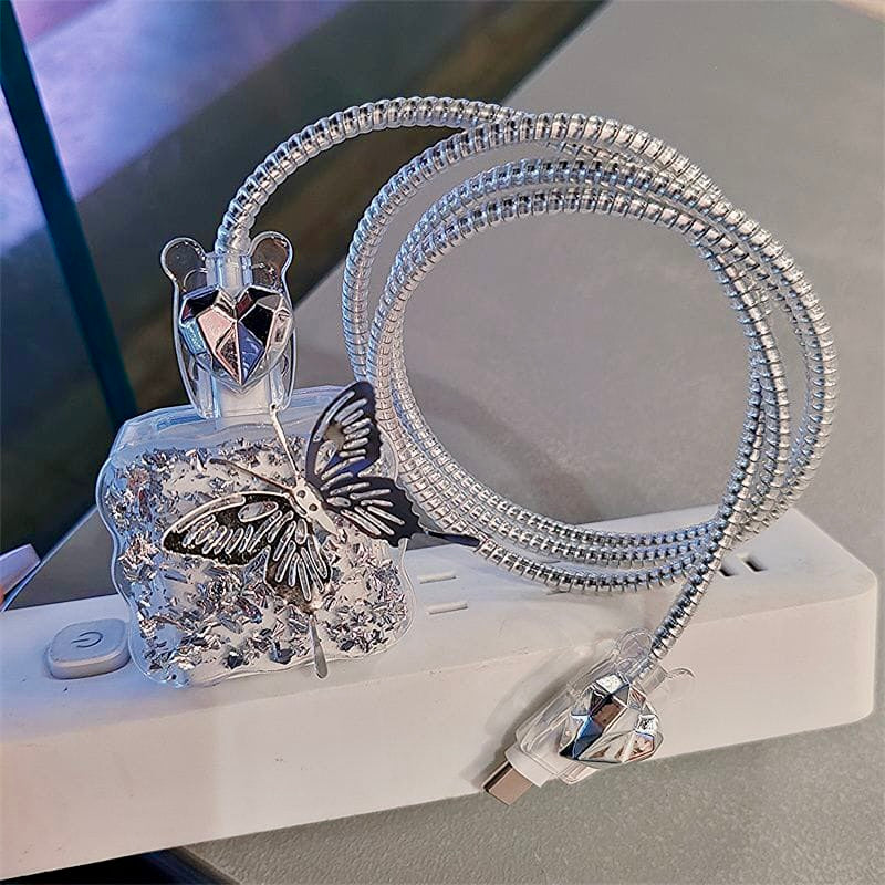 Bring elegance and safety to your charging essentials with the iPhone 20W Charger Case with 3D Butterfly Heart Design. This premium accessory not only adds a stunning decorative touch but also ensures complete protection for your charger and cable. Designed with a glittery butterfly case, diamond heart ends, and a durable coiled wire protector, it makes your charger stylish and long-lasting.