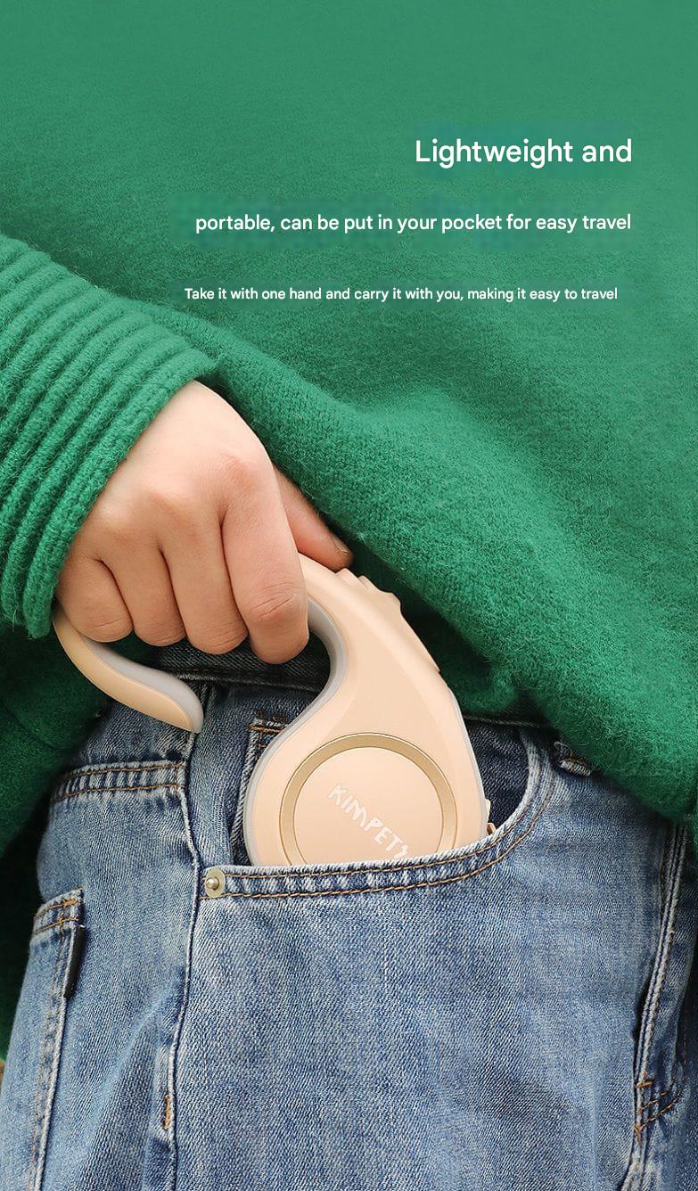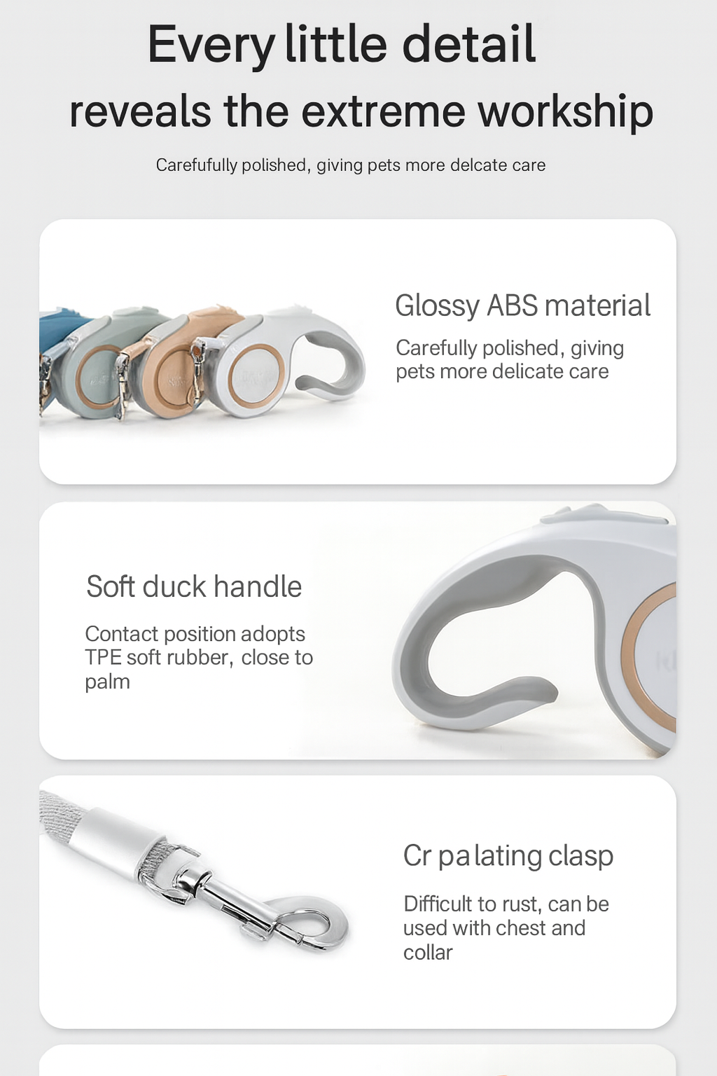 A high-quality retractable pet leash built with glossy ABS casing, TPE soft rubber handle, and sturdy polyester rope. Equipped with a 360° tangle-free U-shaped outlet, it prevents rope twisting and ensures smooth extension and retraction.